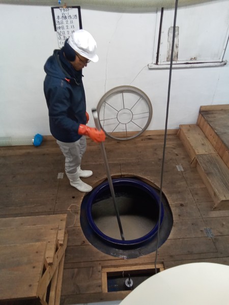 蒸した米を発酵させ、酵母タンクへ移したものを、階段を上がってタンクの上から見せていただきました。作業は毎日行われていて、この時もちょうどかき混ぜているところでした。