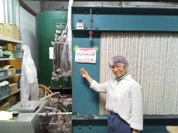 私たち見学の一行は、運良く酒粕を絞り機に通した大吟醸の、火入れ前のお酒を試飲させていただくことができました。